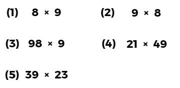 - दो या तीन अंकों की संख्या को 2 अंकों वाली संख्या से गुणा एवं किसी संख्या में 10 व 100 का मौखिक गुणा करना।
